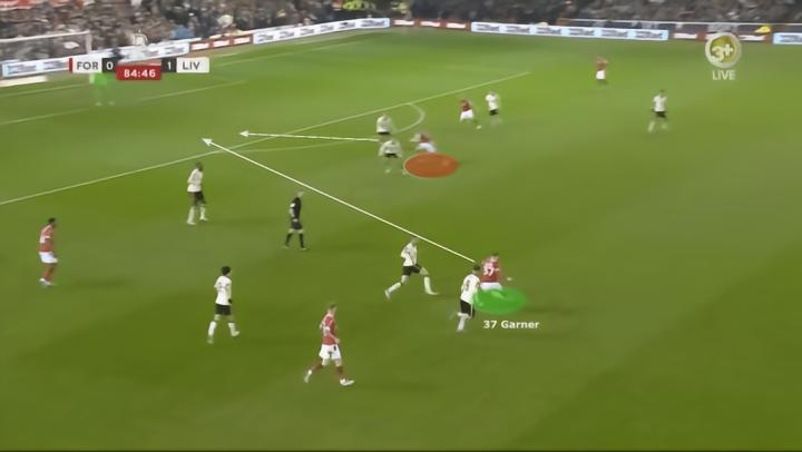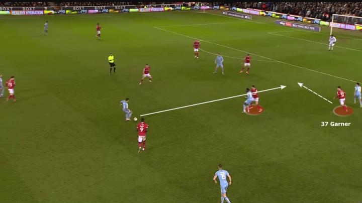 再比如,加纳在客场1-0战胜卡迪夫城的比赛中进球。由于三名森林球员将卡迪夫的后防线限制在了小禁区内,加纳从自己的位置上游走加入了进攻,并在禁区边缘等待机会。