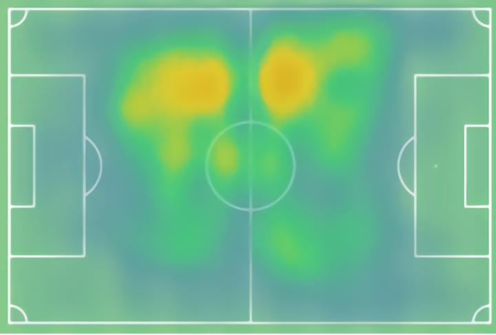 加纳的热力图显示了他在球场上的活跃程度,他在左路占据主导地位。这也凸显了他的自由度可以覆盖所有区域,无论是在前场创造机会、在中路施加压力、还是回防加入中后卫的工作。