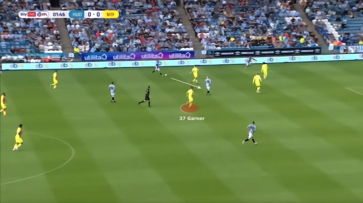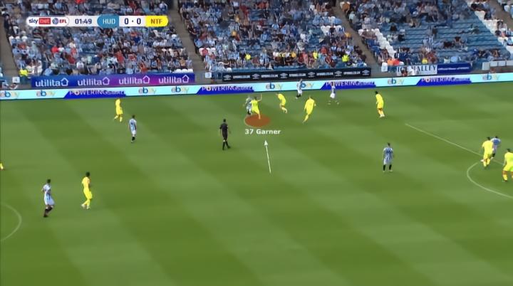 下面是加纳逼抢对手并为球队赢回球权的完美例子。传球一过,他就向哈德斯菲尔德的球员移动,干净利落地拦截下皮球,加纳无疑是一个面对挑战从不退缩的球员。