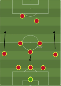 伊维奇的过渡3-5-2阵型,允许边翼卫肯·塞马和费梅尼亚进一步推进到中场,并尽可能地帮助前面的两名球员,形成一个临时的3-3-2-2阵型,加纳可以利用阵型变换推进成为临时的10号位,从而形成3-2-3-2阵型,由6号位球员掩护他。然而,当沃特福德在前场失去控球权时,边后卫已经推到了很靠前的位置,球场两边的区域是空的,加纳和其他中场必须覆盖边路的空缺,直到塞马和费梅尼亚重新回到他们的位置,进而改为防守5-3-2阵型。