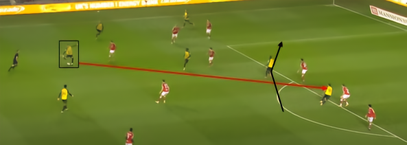 当球回传后,对方球员对角线跑进了右侧中后卫前抢而留下的空间。加纳发现了他身后发生的事情,并追踪对方进攻球员的跑位,最终拦截了来袭的直传并清除了危险。