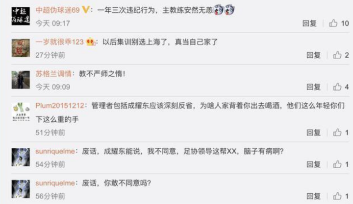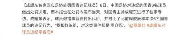 U19国字号球员多次发生严重违纪的现象后,有网友将矛头对准了主帅成耀东,认为其毫无管理能力,也应负责。