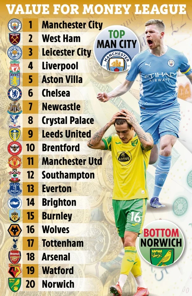 近日《太阳报》分析了上赛季英超20支球队的所获积分、进球数量和季票价格等因素,对上赛季20支球队的季票性价比进行排行。