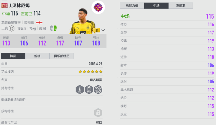 21NG是贝林厄姆非常有性价比的一个赛季,工资也低,适合平民玩家作为引援目标。21NG贝林厄姆的中场推进能力不错,他盘带出色、速度较快,可以持球向前引领进攻;当我方被对手高压逼抢时,贝林厄姆可以由中后场拿球摆脱,并将球送到前场,从而获得更明朗的进攻局面。贝林厄姆前插频率适中,有机会可以尝试远射,不过总体的射门精度一般,需要操作来弥补。贝林厄姆视野开阔,可以送出精准的长短传,是很优秀的“中场发牌器”,新版本里过顶长传优化,贝林厄姆可以多尝试送出斜传。综合来说,21NG贝林厄姆是一个“小六边形”中场,在攻防两端都有一定贡献,能起到承上启下的战术作用。