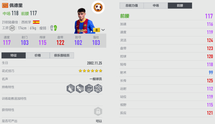 新版本对于控球细腻的球员很有利,E21佩德里也是受益的一个。他在前腰位置虽然对抗一般,不过对球的掌控力强,接球后的急停和变向很舒服,往往让对手上抢失败,这时佩德里可以利用空间来助攻或者尝试搓射。E21佩德里的射门能力不错,除了搓射外,直接抽射远角也没问题,得分手段不局限。佩德里有“传球大师”的特性,传威胁球的精准度让人满意,不过一些路线明显的直塞也容易被拦截。E21佩德里是一名“司令官”式的进攻核心,既能疏导进攻,关键时刻还能自己射门,喜欢现役年轻球员的玩家可以一试。