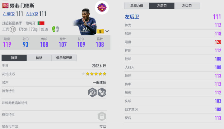 努诺.门德斯虽然年龄不大,不过游戏里的赛季卡比较多样,综合工资和性价比来说,21NG是个不错的选择。门德斯拥有很快的速度,这在新版本里优势更大,可以跟上前插的边锋,压缩对手的传中空间。门德斯的抢断效率高,往往能突然上抢将球权夺下,给我方创造反击机会。21NG门德斯的AI很不错,不会轻易丢失位置,跟防和补位意识好。门德斯模型不是太大,低重心在手控时很稳健,能跟上对手的晃动,螃蟹步移动迅速,变向不会生硬。在进攻端门德斯也有不俗发挥,他的高球传中精准,插上后可以送出助攻,并且帮助边锋分担边路的推进压力。在245工资帽下,19工资的21NG门德斯可以成为玩家们左后卫提升的重要选项,相关套装的朋友可以考虑入手。