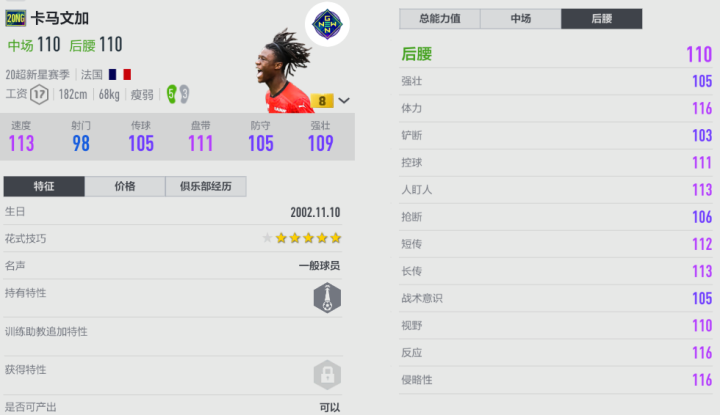 游戏里卡马文加的赛季还不算特别充足,但20NG也有基本的强度,喜欢卡马文加的朋友可以使用。卡马文加的速度快,在中场能提供大范围的覆盖和扫荡面积,场上的存在感强;他的惯用脚是左脚,用顺足出球精度不错,逆足的话一脚出球容易失误,需要先调整身体姿势。20NG卡马文加不能作为单后腰使用,他还是以区域抢断和压迫为主,所以最好是双后腰阵型。卡马文加的拿球手感不错,对于习惯中场多控球的玩家来说,会觉得比较舒适。卡马文加的射门有待加强,除非绝对空位,否则不建议过多尝试起脚。