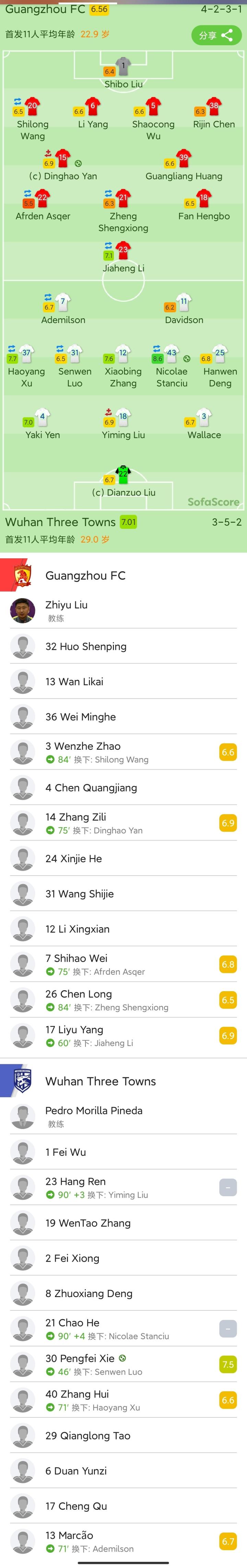 武汉三镇首发:22-刘殿座、4-殷亚吉、18-刘奕鸣(90′23-任航)、3-华莱士、25-邓涵文、37-徐皓阳(U23)(70′40-张辉(U23))、43-斯坦丘(90′21-何超)、12-张晓彬、31-罗森文(46′30-谢鹏飞)、7-埃德米尔森(70′13-马尔康)、11-戴维森