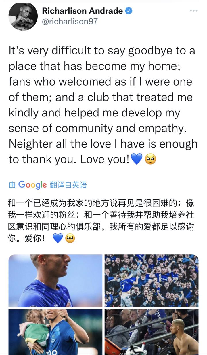 在确认转会后,理查利森在社交媒体上发帖说:“很难告别一个已经成为我家的地方,告别那些欢迎我的球迷,就像我是他们中的一员一样,以及一个善待我并帮助我的俱乐部培养我的社区意识和同情心。”