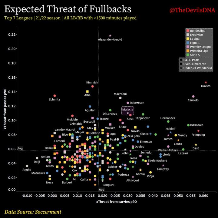 即便将马拉恰的预期威胁与排名前七联赛的所有边后卫进行比较,他的表现依旧可圈可点。尽管我们需要考虑到不同联赛之间的差异,马拉恰的数据到了英超赛场会有下滑,可他的位置还是很不错,在上面的可视化数据图中位于右上方的象限里,说明通过带球和传球制造威胁的能力较强。在U24球员这个群体中,除开亚历山大-阿诺德和阿方索-戴维斯这两个超级大妖,接下来最好的人选就是马拉恰了。所有迹象都表明,马拉恰能成为一位攻守兼备的边后卫,巅峰状态下能为一支顶级球队提供可观的进攻威胁。