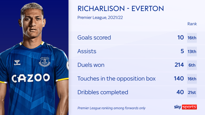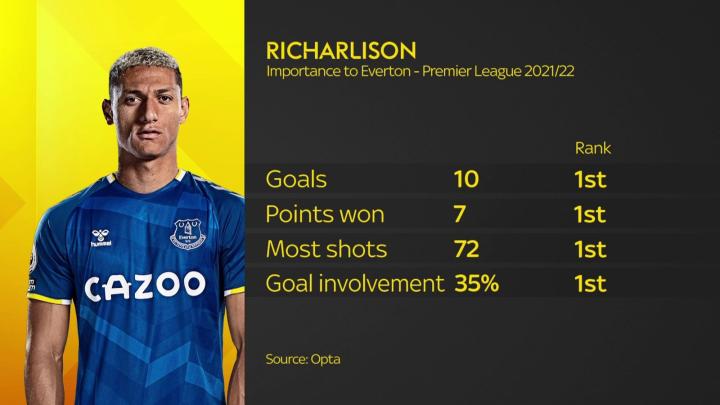 里沙利松上赛季进攻数据一览,堪称埃弗顿的绝对大腿