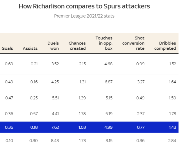 里沙利松与热刺锋线众将数据对比(自上到下,孙兴慜、贝尔温、凯恩、库卢塞夫斯基、里沙利松、贝尔温;自左至右,场均进球、助攻、对抗成功、创造机会、对手禁区内触球、射门转化率、盘带成功)