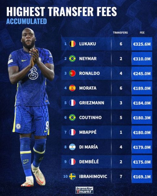 切尔西中锋卢卡库租借回归前东家国际米兰,德国知名足球数据网站“转会市场”显示,卢卡库这次租借回归的费用是800万欧。同时“转会市场”列出了足坛累计转会费排名,卢卡库6次转会的总转会费超过3.2亿欧,排名足坛第一。