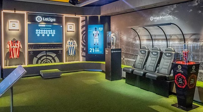 西班牙联赛展区展示了西甲、西乙联赛的冠军球衣,每年有超过五万名游客参观游览,在参观纳达尔个人雕像的同时,可以同时参观西班牙联赛的球衣、奖杯甚至替补席,零距离体验足球职业赛场。