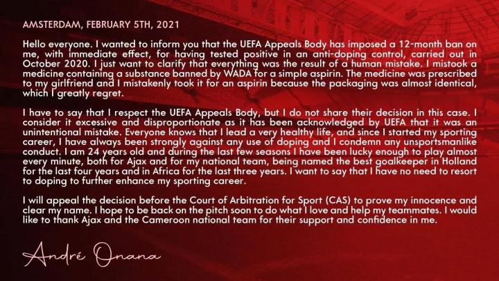 对此范德萨表示:我们明确宣布不会使用兴奋剂,确保足球运动的干净,这是一个可怕的问题,对奥奥纳纳本人和俱乐部而言都是如此。奥纳纳是一名顶级门将,多年来他在阿贾克斯证明了自己。我们曾希望有约束性的禁赛,或者让时间短于12个月,因为停赛并不是为了让他增强身体表现。“
