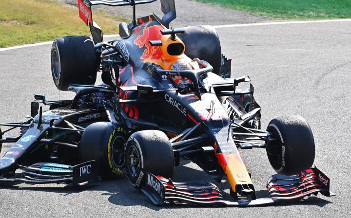除了上面提到的勒克莱尔,Halo此前最知名的案例就来自于上赛季汉密尔顿和维斯塔潘的那次碰撞——失控的红牛赛车直接“骑”在了奔驰赛车上,如果没有Halo顶着,汉密尔顿的头盔将会承受大部分赛车的重量,后果可想而知: