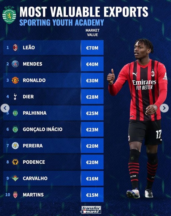 葡超劲旅葡萄牙体育出品过很多优秀的球员,德国知名足球数据网站“转会市场”统计了由葡萄牙体育青训出品的球员目前的身价。在这份榜单中,米兰攻击手莱奥目前的身价达到7000万欧,是目前所有葡萄牙体育俱乐部青训出品的球员中身价最高的。37岁的C罗排名榜单第三。
