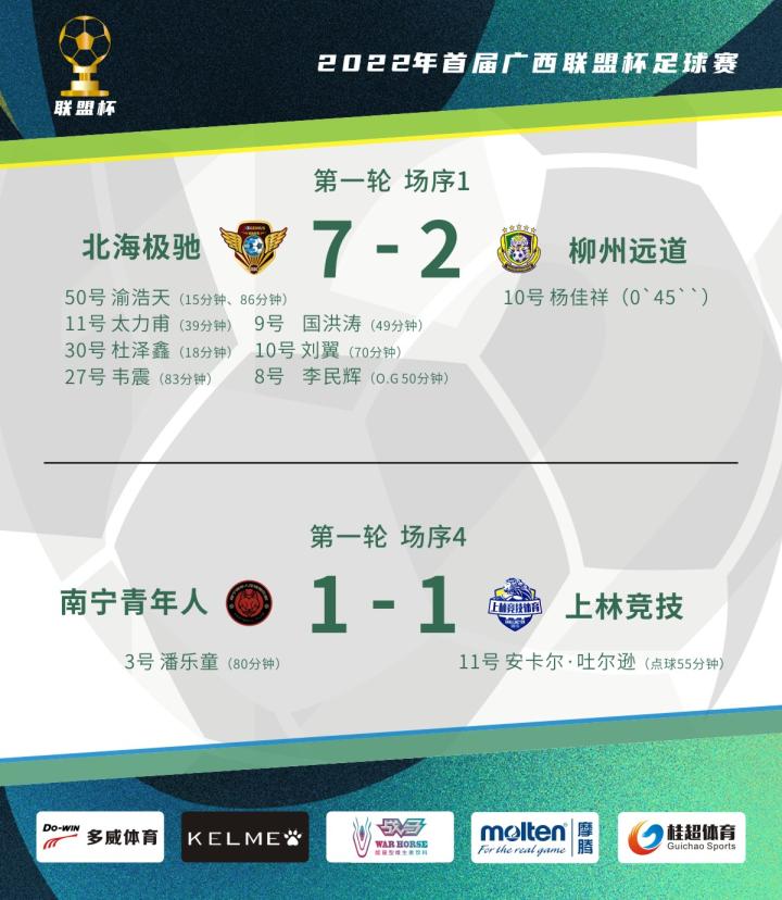 比赛开场仅仅45秒,柳州远道队长10号杨佳祥40米开外的一脚精彩吊射攻破北海极驰的大门,1-0,这是首届广西联盟杯的第一个进球。2011年3月26日,首届桂超联赛揭幕战,柳州好石1比0桂林天龙,桂超的第一个进球队员也是杨佳祥,自此杨佳祥带领柳州远道披荆斩棘,成就桂超六冠王伟业,个人也多次荣膺最佳射手和最佳球员,11年后又是杨佳祥攻入广西联盟杯第一个进球,仿佛就是一个神奇的轮回。