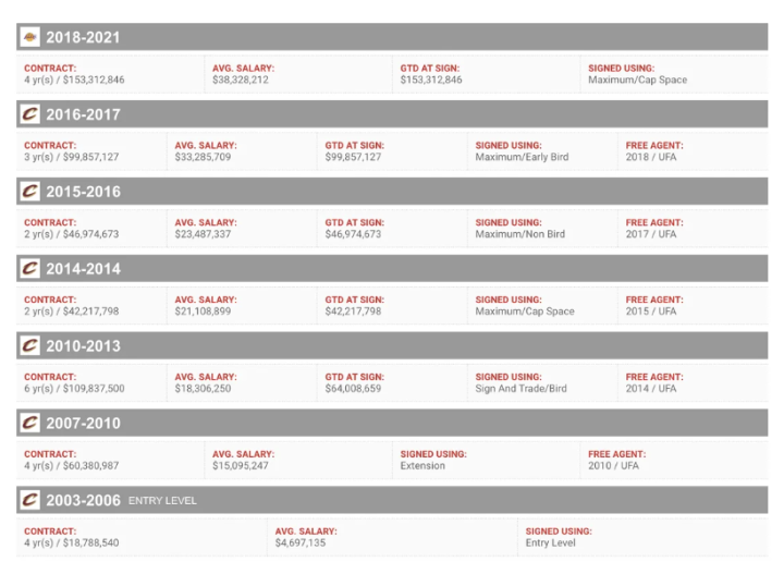 2022-23赛季他的工资为4447万美元,若顺利打完该赛季,他的生涯总薪水会是4.31亿美元。