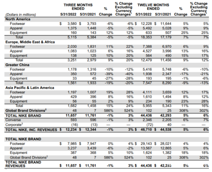 2022财年,耐克大中华区全年营收为75.47亿美元,同比下降9%。耐克方面表示,大中华区业绩主要受到由大范围疫情导致的库存、物流及运输成本增加的影响。