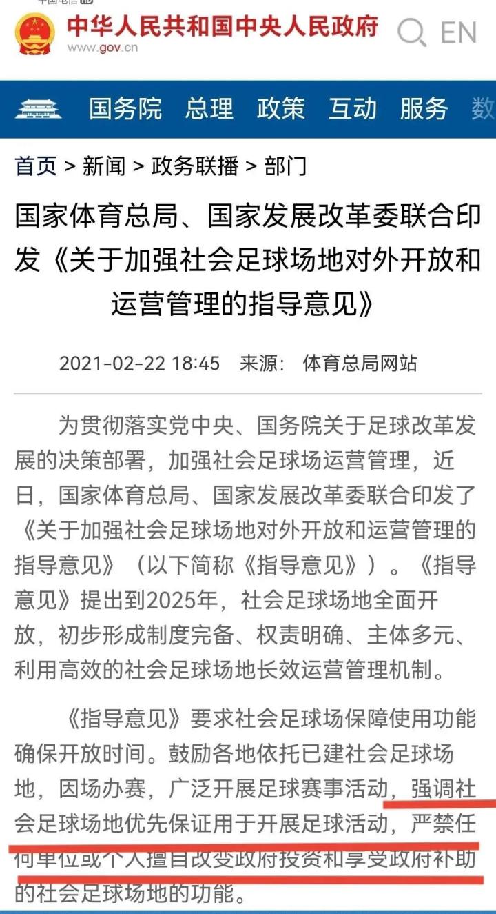 这一点也在政府的文件中有所提及,21年2月国家体育总局与国家发改委联合印发的《关于加强社会足球场地对外开放和运营管理的指导意见》中就说明了,社会足球场地优先保证用于开展足球活动,严禁任何单位或个人擅自改变政府投资和享受政府补助的社会足球场地的功能。