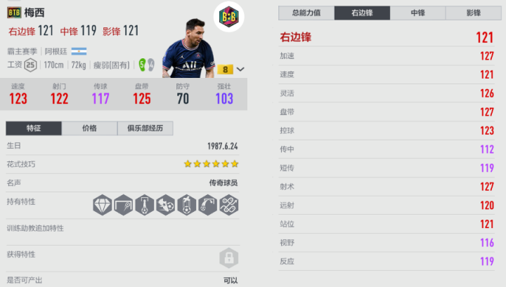 一提到游戏里的“小快灵”边锋,那么很多玩家会首先想到梅西,他有多个赛季卡种,本期介绍的是BTB赛季。BTB梅西的手感很轻盈,带球做动作丝滑,可以在前场进行连续变向突破;虽然是“瘦弱”模型,但是梅西的底盘稳健,有一定的对抗能力,平衡高,不容易被推挤走。BTB梅西搓射精度极高,他可以内切晃开空间,然后大力搓射远角,这能成为稳定的得分手段之一。BTB梅西的绝对速度适中,他的强项是突然启动加速快,因此可以衔接QE和EC等微操,来强制变节奏,防守球员往往跟不上。梅西的传球也是一绝,直塞或者下底倒三角都能造成比较大的威胁。工资帽上涨后,25工资不会成为负担,BTB梅西值得信仰玩家使用。
