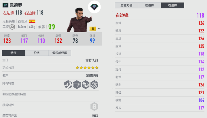 各赛季佩德罗的共同点之一是手感非常丝滑,UP赛季也不例外,对球的控制很稳定。佩德罗的重心低、加速快,可以短时间完成加速过程,高速奔袭突破;当1对1进攻时,佩德罗可以左右晃动骗对方失误。佩德罗的左右脚都有高质量射门,在大禁区线附近,有空当可以果断搓射;佩德罗前插肋部的意愿好,接到过顶长传或者直塞后,能够把握机会低射或抽射远角。UP佩德罗也是一名小模型边锋,如果遭遇到沃克这种重型边后卫,那对抗不占优势,需要扬长避短,减少对抗次数,从而赢得更多跑位和射门机会。