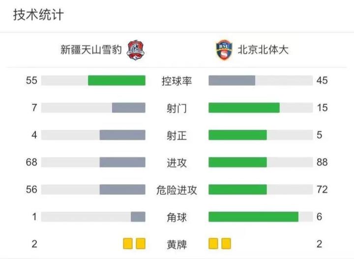 此次比赛主教练帕尔哈提选用首回合替补阵容为再度交锋的先发阵容,上半场,北京北体大场面占据上风,先发阵容的小将出现配合失误,在长传接球上多次被抢断,具有威胁性的进攻也被对方防守球员解围,但在你来我往的过程中,先发的小将们守住防线,上半场双方0比0战罢;易边再战,天山雪豹做出人员调整,时间、拜拜提等上场。比赛第62分钟,天山雪豹率先打破僵局,马博康左路传中,时间侧身接球推射破门,新疆天山雪豹1比0领先北京北体大;在随后的比赛中,北京北体大不断地进攻,天山雪豹顶着前场压力,化被动为动力,大家拼劲十足,激起进攻欲望;时间、佧米然前场逼抢,比赛第70分钟,拜拜提门前推射,皮球滑门而过;最终,天山雪豹1比0战胜北京北体大,七轮过后,天山雪豹的积分达到了11分。