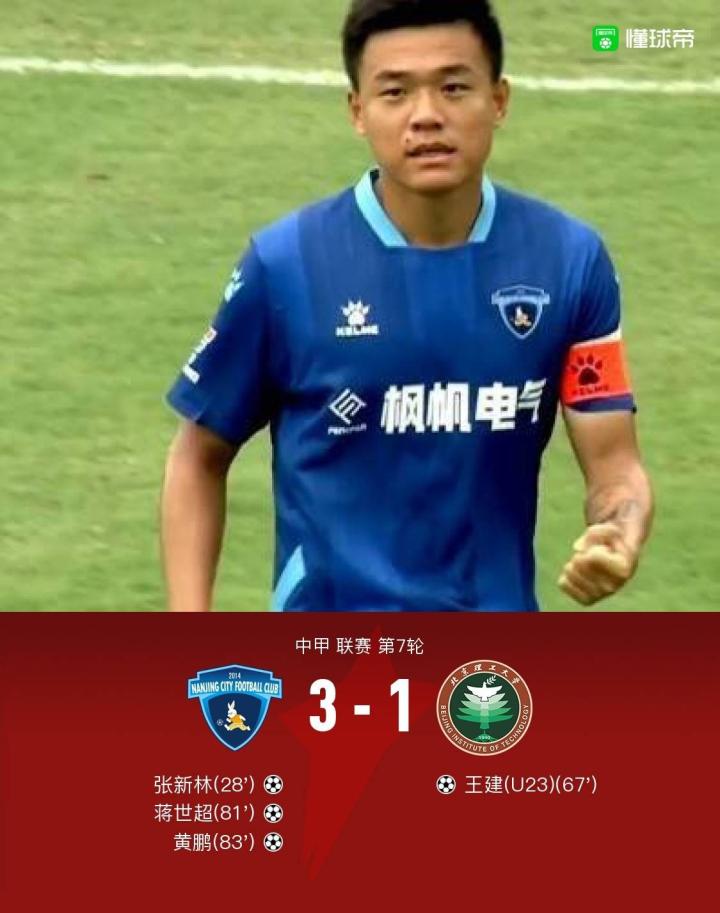 南京城市3-1送北理工5连败,张新林、蒋世超建功,王建世界波
