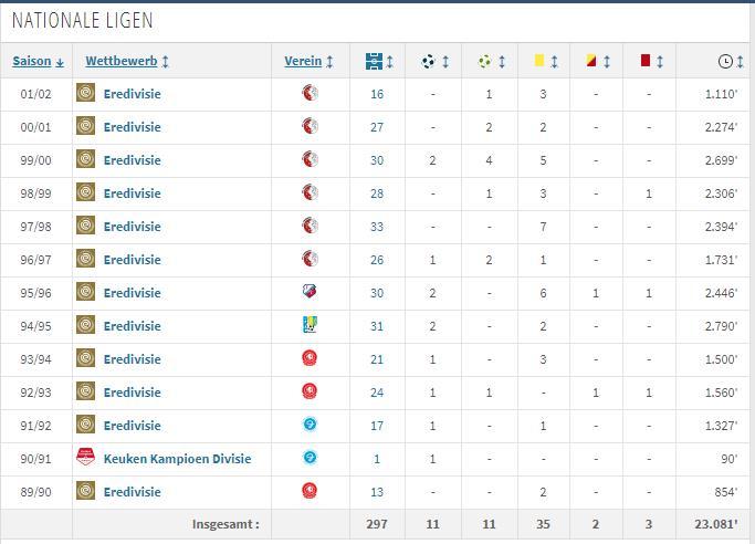 其中荷甲联赛出场296次,共计打进10个进球,另有11次助攻。滕哈格为特温特队出场最多,达到253次,打进6个进球,有11次助攻。