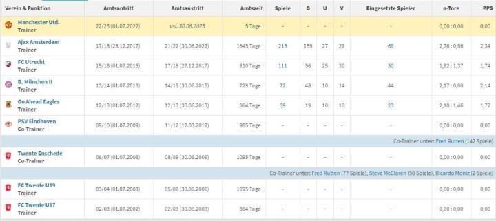滕哈格带领拜仁二队踢了72场比赛,战绩为48胜,10平,14负,场均积分为2.14分。但仅仅是在德国地区联赛的执教经历并没有让滕哈格有质的提升。