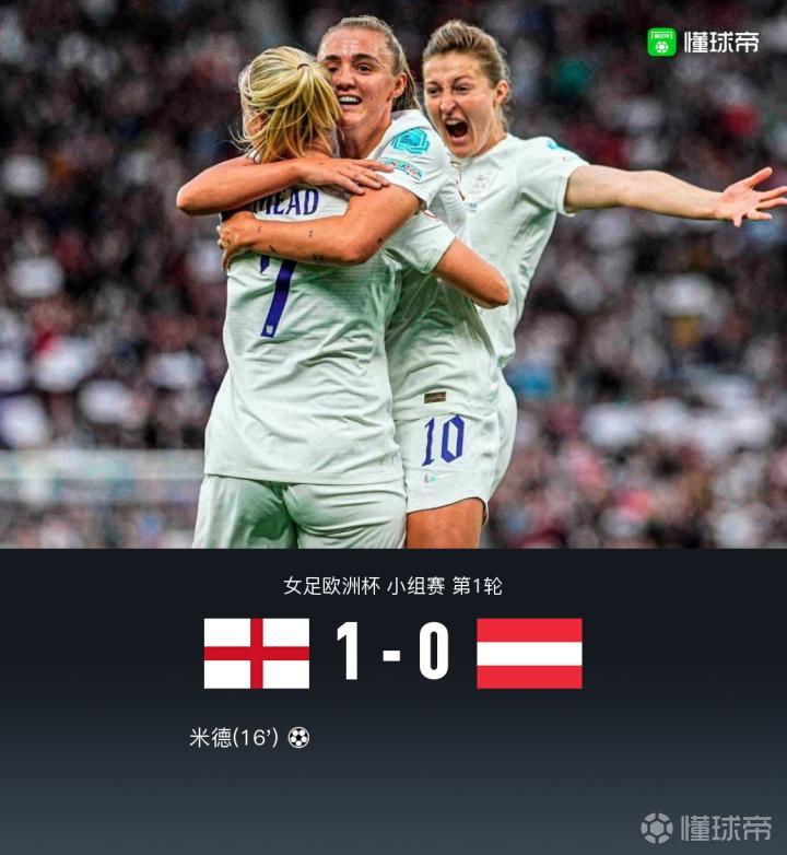 北京时间7月7日凌晨3:00,女足欧洲杯小组赛英格兰女足对阵奥地利女足的比赛在老特拉福德打响。上半时比赛,柯比过顶球传至门前,米德面对门将挑射越过门线为英格兰女足先拔头筹,下半时比赛双方互有攻守但均为建树。最终,英格兰女足凭借米德的进球斩获女足欧洲杯小组赛开门红。