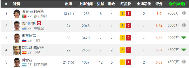 已经年过30岁的格列兹曼目前身价3500万欧元,在本次统计中他已无缘马德里竞技队内身价排行榜的前5位。