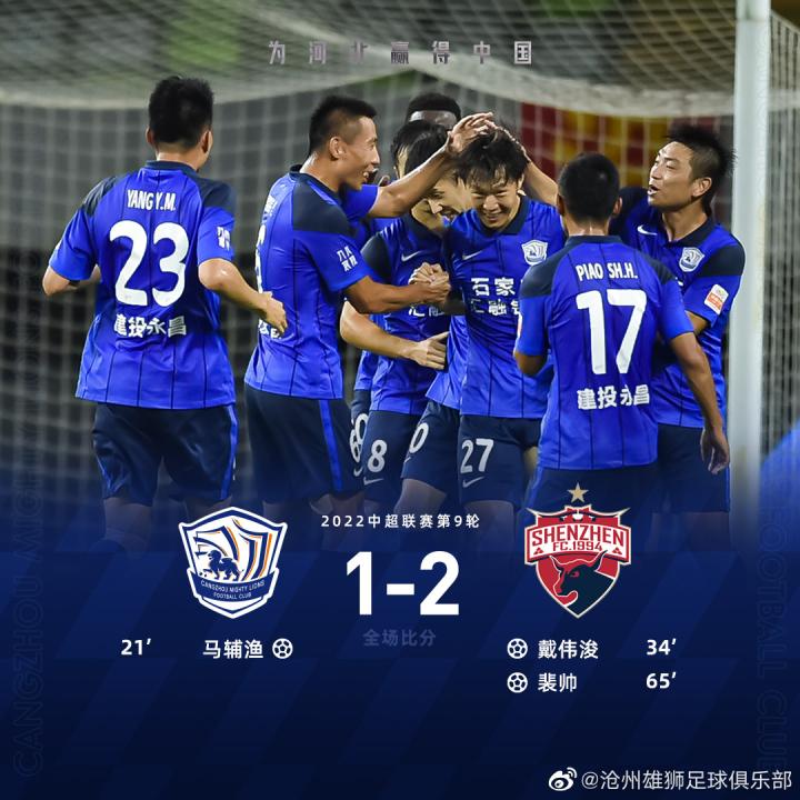【战报丨马辅渔首球奥斯卡伤退 雄狮1-2遭深圳逆...沧州雄狮足球俱乐部 @懂球帝2022-07-07 22:45【战报丨马辅渔首球奥斯卡伤退 雄狮1-2遭深圳逆转】 7月7日晚,2022赛季中超联赛第9轮,沧州雄狮对阵深圳。 上半场,刘鑫瑜送出助攻,马辅渔收获个人中超首球,戴伟浚为深圳扳平比分。下半场,雄狮因为一次争议角球判罚被对方反超比分,随后奥斯卡伤退,邵镤亮补时阶段扑点。最终沧州雄狮1-2不敌深圳。(全场回顾:战报丨马辅渔首球奥斯卡伤退 雄狮1-2遭深圳逆转)展开更多