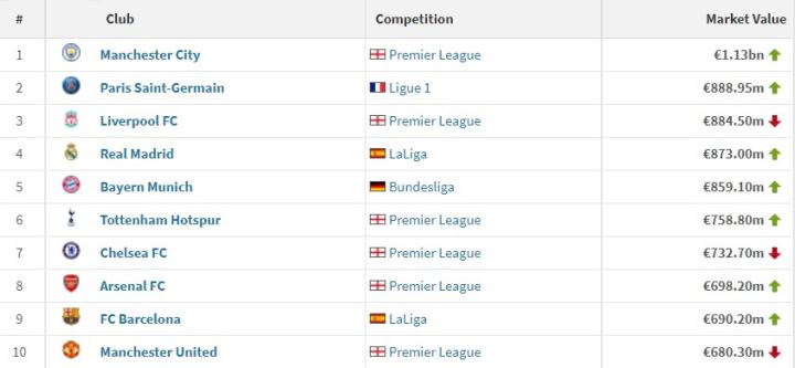 1.曼城(11.3亿欧)