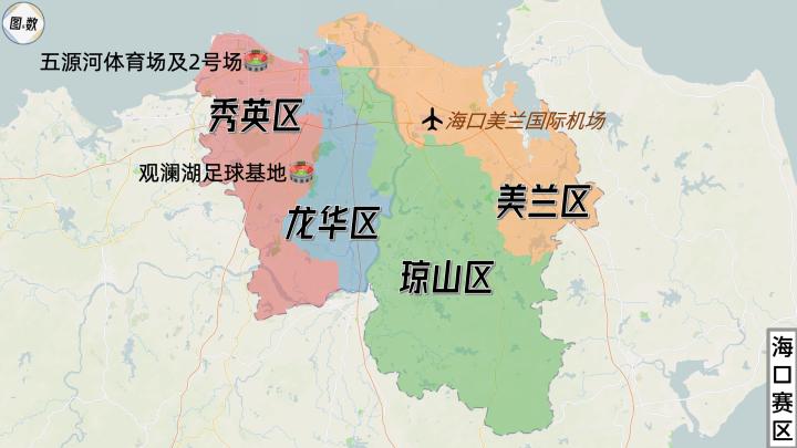 海口赛区的3座体育场中有2座挨在一起——五源河体育场及2号场,他们都位于秀英区北部,建成于2018年,主体育场的观众席内设有4.1万个座位,是海南省最大的体育场。