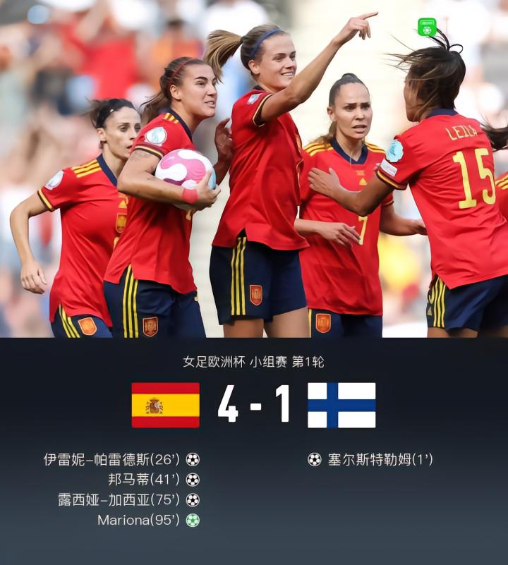 西班牙女足4-1芬兰女足,马里奥娜传射建功,邦马蒂破门
