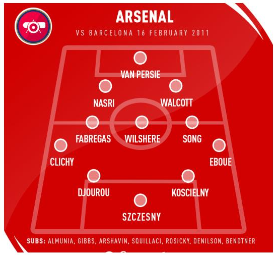 2010/11赛季欧冠1/8决赛,阿森纳遭遇了如日中天的瓜氏巴萨。首回合主场作战,温格摆出4321/451阵型,单箭头范佩西身后有5名球员投身入中场争夺战,目的就是不让哈白布组合随意支配球权。