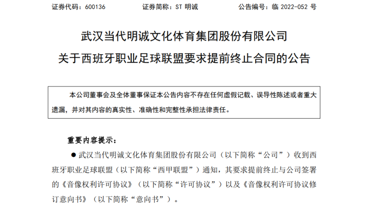 6月22日晚间,A股上市公司当代明诚(简称:ST明诚)发布公告称,西甲联盟以公司4,500万欧元保证金逾期未付为由,决定终止与公司签署的一系列音像权利许可协议,中国足球又一颗暗雷被引爆。