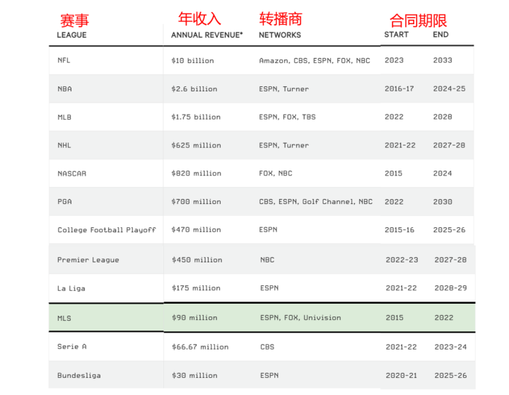 MLS目前与ESPN、FOX、Univision等有线电视媒体的转播合同年始自2015年,年转播收入仅为9,000万美元,苹果以一己之力将MLS的版权价值推升了两倍。