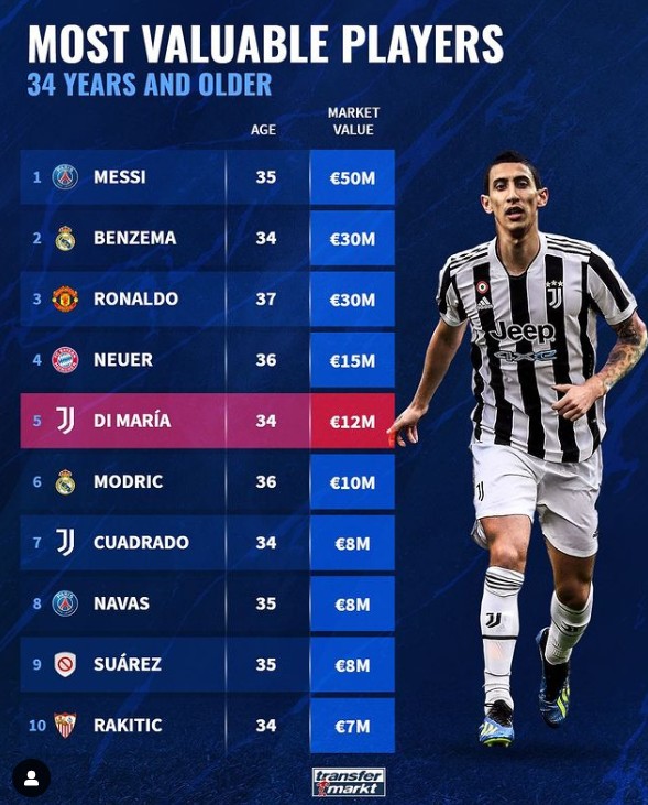34岁以上球员身价排名:梅西5000万欧第一,迪马利亚第五