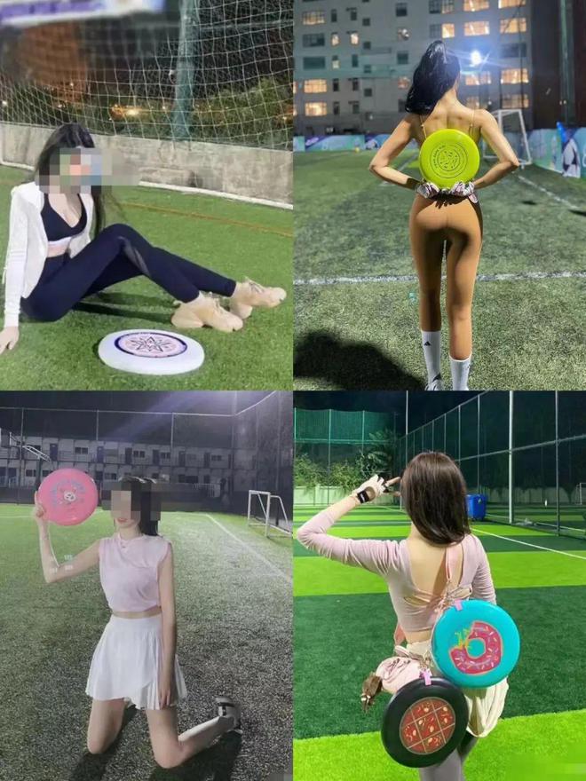对于那些衣着暴露,拿着飞盘在足球场上打卡的名媛们来说:飞盘不过是他们摆出pose,吸引他人,非正常社交的道具。她们坐着或站着,背对着甚至跪在草地上,做出极具诱惑的动作,还有人特意撅起臀部或挺起胸部,展示自己傲人的曲线。