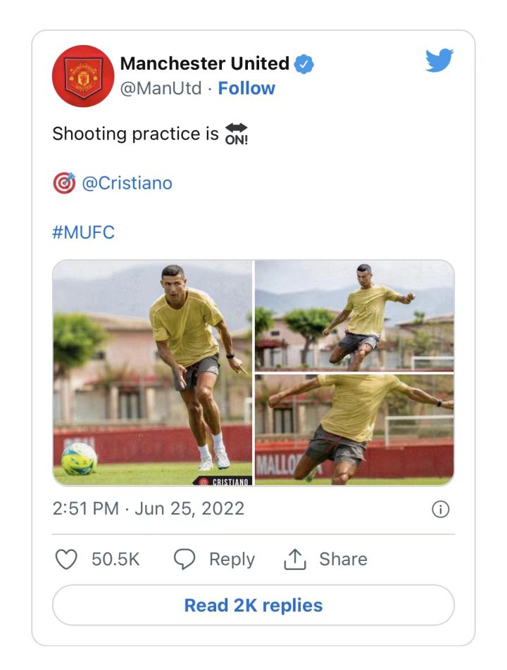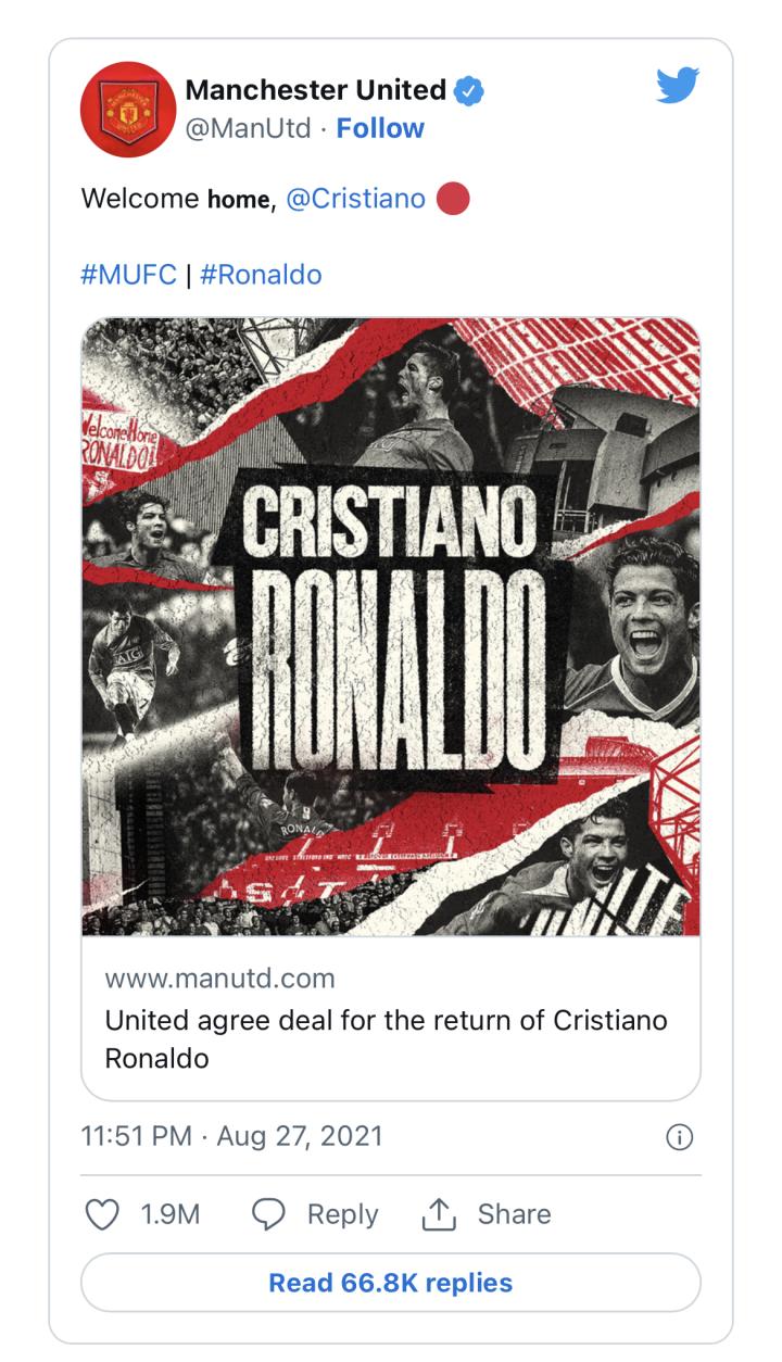 2021-22赛季期间,曼联的内容团队充分利用C罗的影响力做商业推广。比如3月1日至14日期间(这是随机指定的时间段),曼联就在推特上发布了33条与C罗相关的信息。