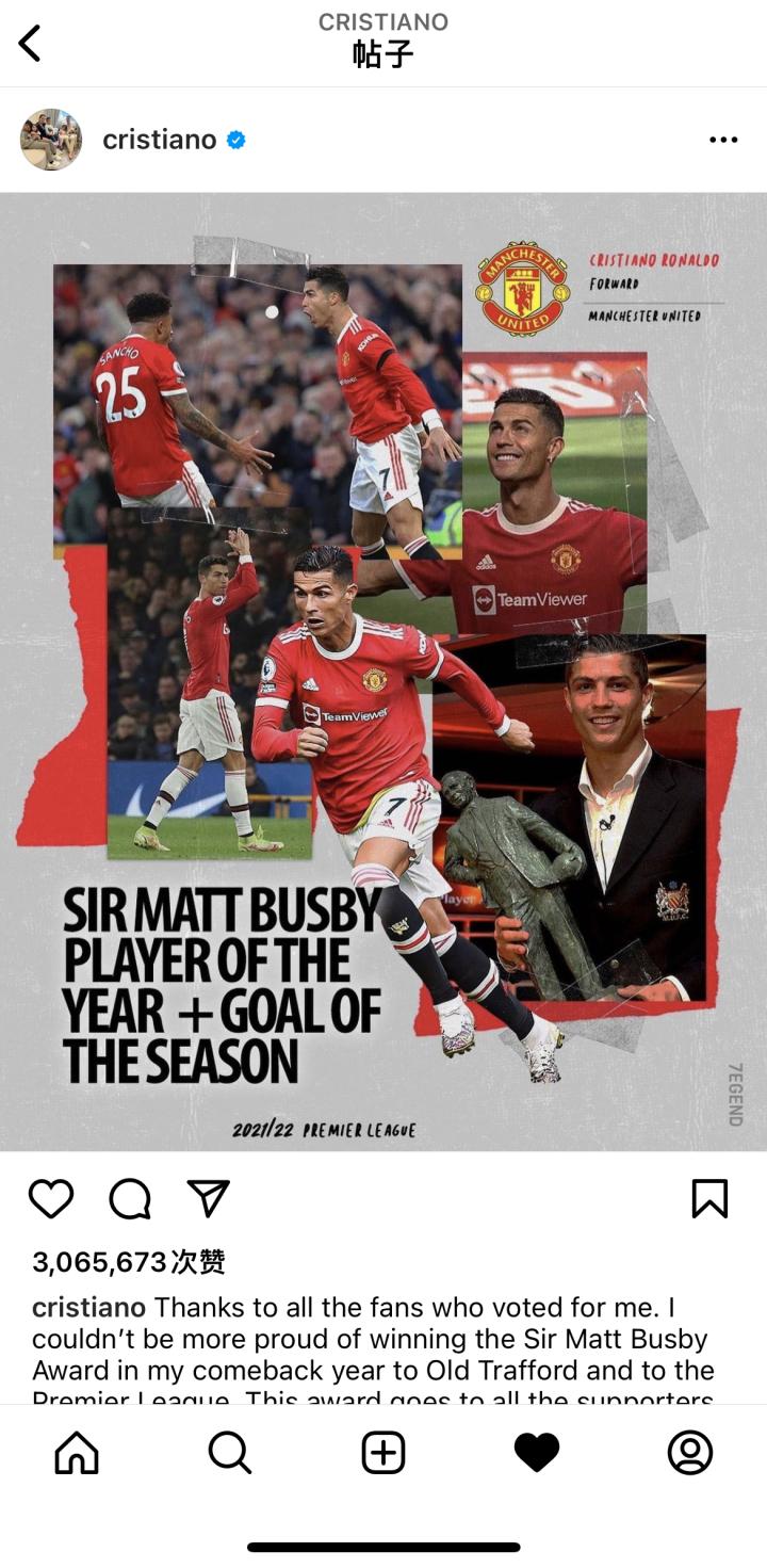 在社媒影响力方面,C罗在推特上有1.016亿粉丝,曼联只有3150万粉丝。