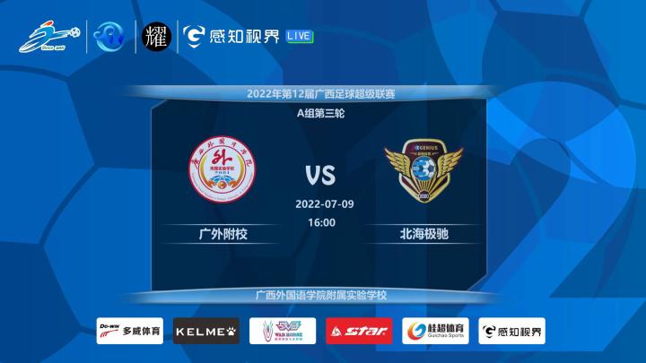7月9日下午,2022第12届广西足球超级联赛(桂超联赛)第三轮开赛。7月9日16时,广西外国语学院附属实验学校足球场,桂超第三轮,广西外国语学院附属实验学校主场对阵北海极驰。两支队近况颇佳,北海极驰联盟杯首轮击败柳州远道,广外附校则刚刚夺得南宁市千里杯男子甲组的冠军。