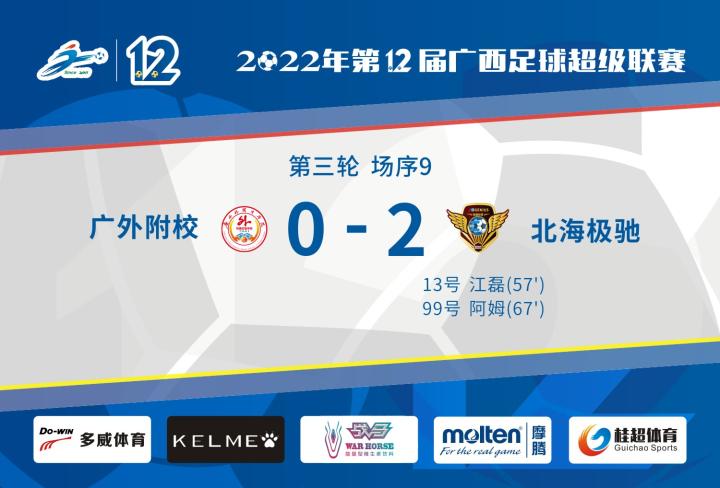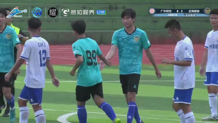 下半场广外附校主动提速,在右路创造了几次不错的机会,但把控整体节奏的还是北海极驰。第57分钟,北海极驰开出右侧角球,江磊高高跃起头槌破门,1-0;失球后的广外附校马上利用闭万鹏的远射和李佳威的劲射威胁对手球门。第67分钟,北海极驰在广外门前打出精妙配合,替补上场的99号阿姆左脚劲射破门,2-0。