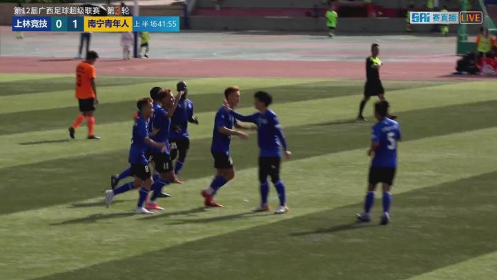 上半场开始,南宁青年人利用连个边路不断攻击上林竞技的后防线。第17分钟,南宁青年人左路组织攻势,传入禁区汪柳璇打门被米尔提扎扑出,莫靖近距离补射得手,1-0;第42分钟,上林竞组织进攻,老将石展鸿一脚直塞撕破防线,31号秦灿突入禁区单刀破门,1-1。