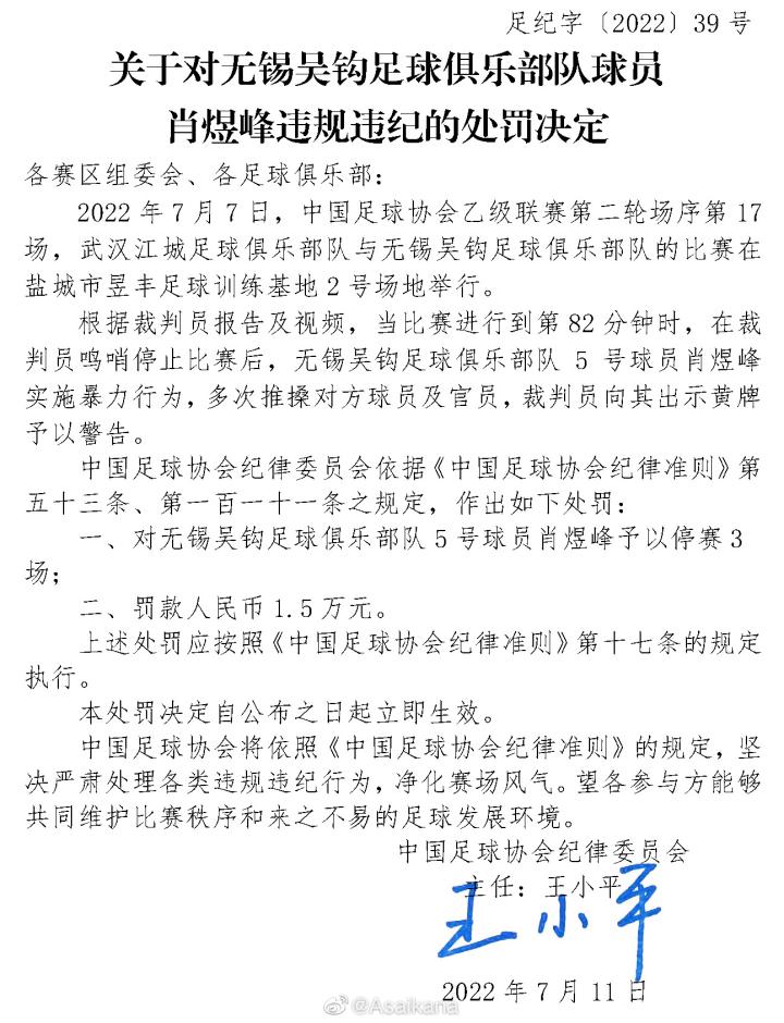 无锡吴钩与武汉江城比赛第82分钟的冲突,无锡队肖...Asaikana @懂球帝2022-07-11 20:23无锡吴钩与武汉江城比赛第82分钟的冲突,无锡队肖煜峰追加停赛3场,武汉江城队教练魏大勇追加停赛4场。展开更多