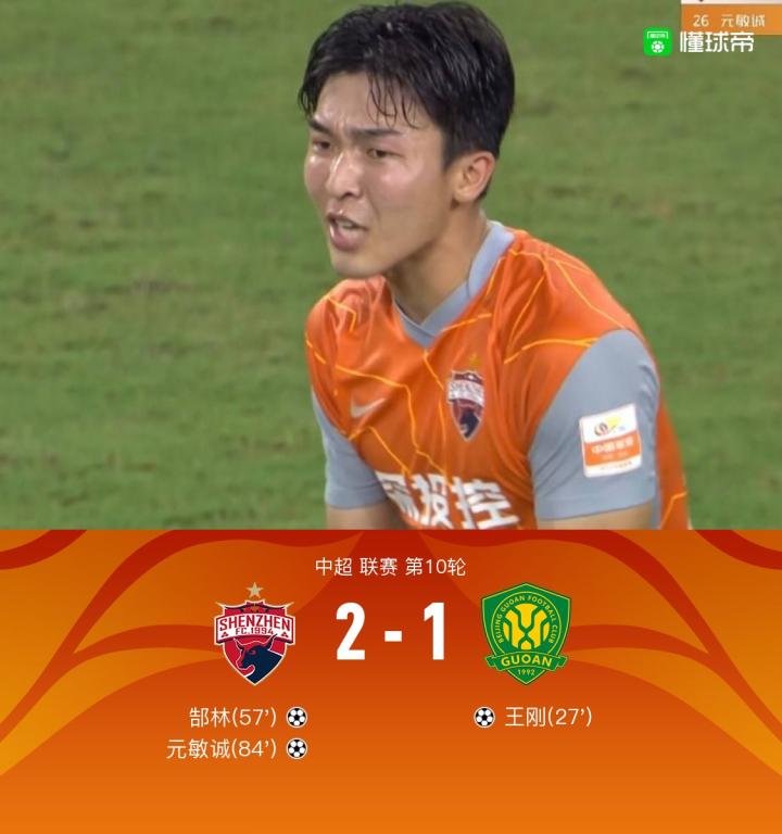 深圳2-1逆转国安,元敏诚、郜林破门,王刚世界波,孙可伤退