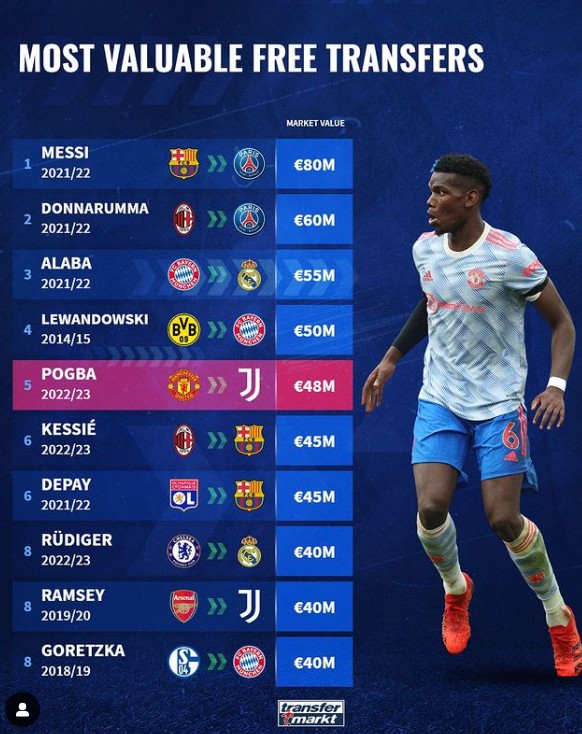法国中场博格巴以自由球员的身份重回尤文图斯,德国知名足球数据网站“转会市场”统计了足坛自由球员交易时,当时自由球员的身价排名。梅西加盟巴黎时的身价是8000万欧,是所有自由球员转会时身价最高的。